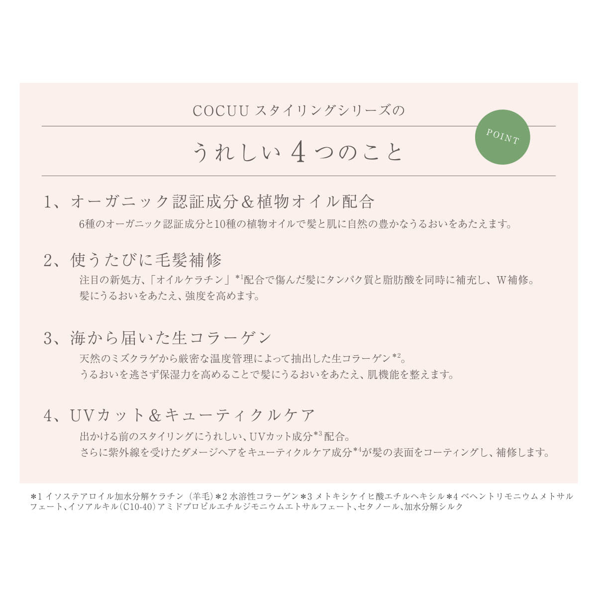 さらに、キューティクルケア成分が紫外線を受けたダメージヘアの表面をコーティングし補修します。