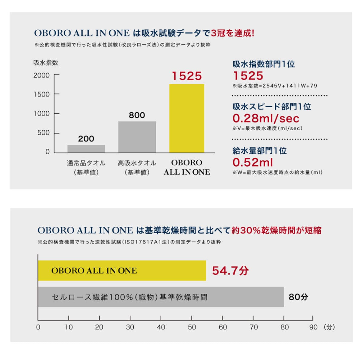 「おぼろオールインワン」は、当社歴代オリジナル商品の吸水試験データ(部門別)において3冠を達成しました。